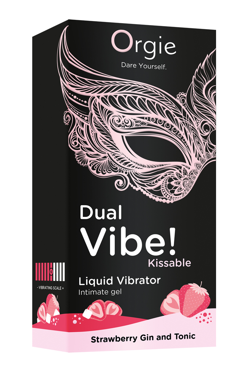 "Dual Vibe! Kissable Liquid Vibrator" est le gel intime d'excitation embrassable de la marque de cosmétique érotique Orgie. Il procure des sensations excitantes (vibrations + picotements) sur les zones intimes tout en étant parfaitement adapté au sexe oral.