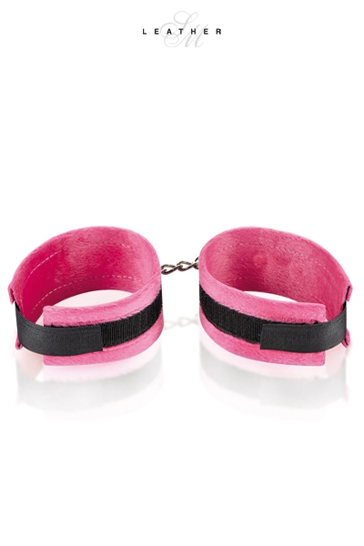 Paire de menottes réglables rose et noir pour poignets, très douces, avec fermeture velcro, fabriquées par Leather SM.
