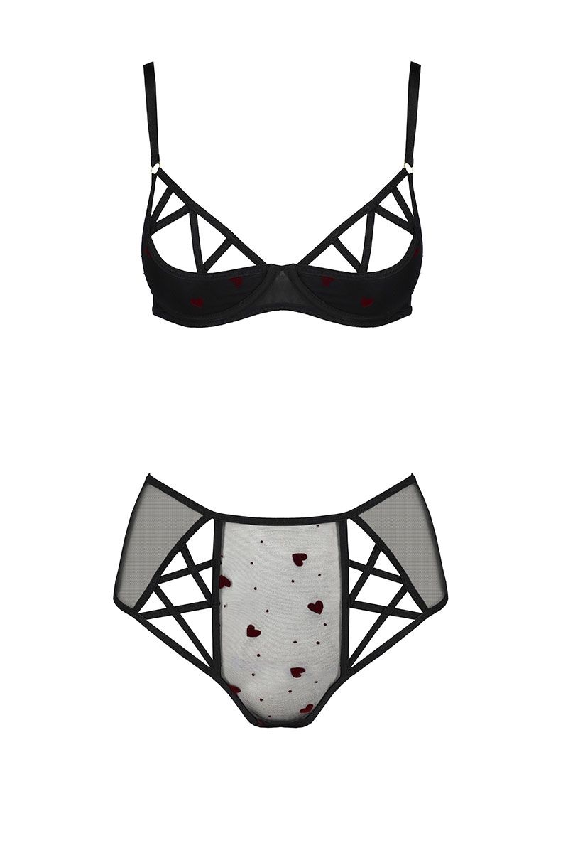 Coupé dans un tulle noir floqué de coeurs rouge sombre, le bikini exploite ses jolies finitions pour exposer un délicieux décolleté seins nus.