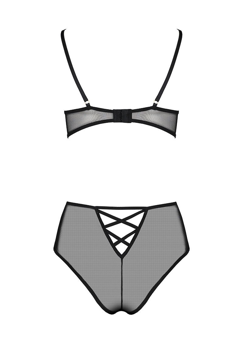 Taille haute et très structurée avec ses jeux de lanières croisées qui s'ouvrent sur les cotés du pubis et au centre des fesses, la culotte noire transparente a beaucoup de charme.