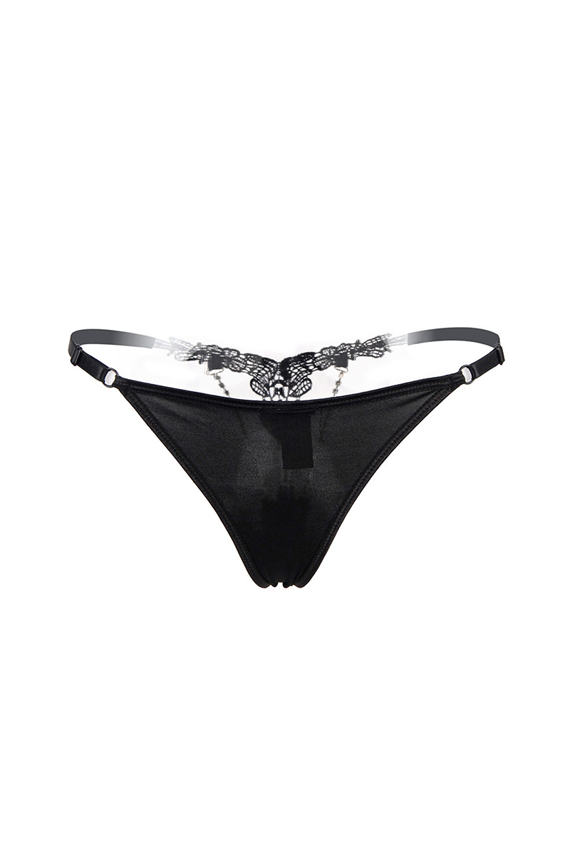 La marque Paris Hollywood nous présente ce string noir ouvert à l'avant et décoré de strass, le summum du charme et de l'audace.