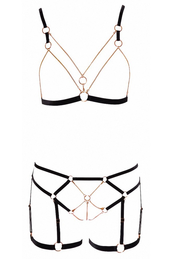 Devant, l'illusion s'efface pour votre plus grand plaisir : l'ensemble compose un harnais totalement ajouré en élastiques de velours et chaines fantaisie rose gold qui cerclent les seins, le pubis, et parcourent la fente intime. De fines jarretières réglables et amovibles accentuent la sensualité de l'ensemble.
