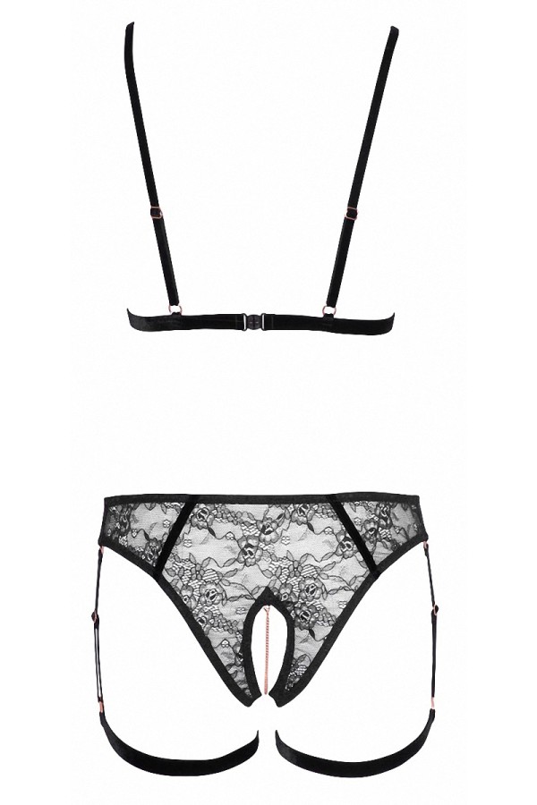 - Ensemble fantaisie harnais/bijoux 2 pièces : culotte ouverte avec jarretières amovibles, et soutien-gorge seins nus