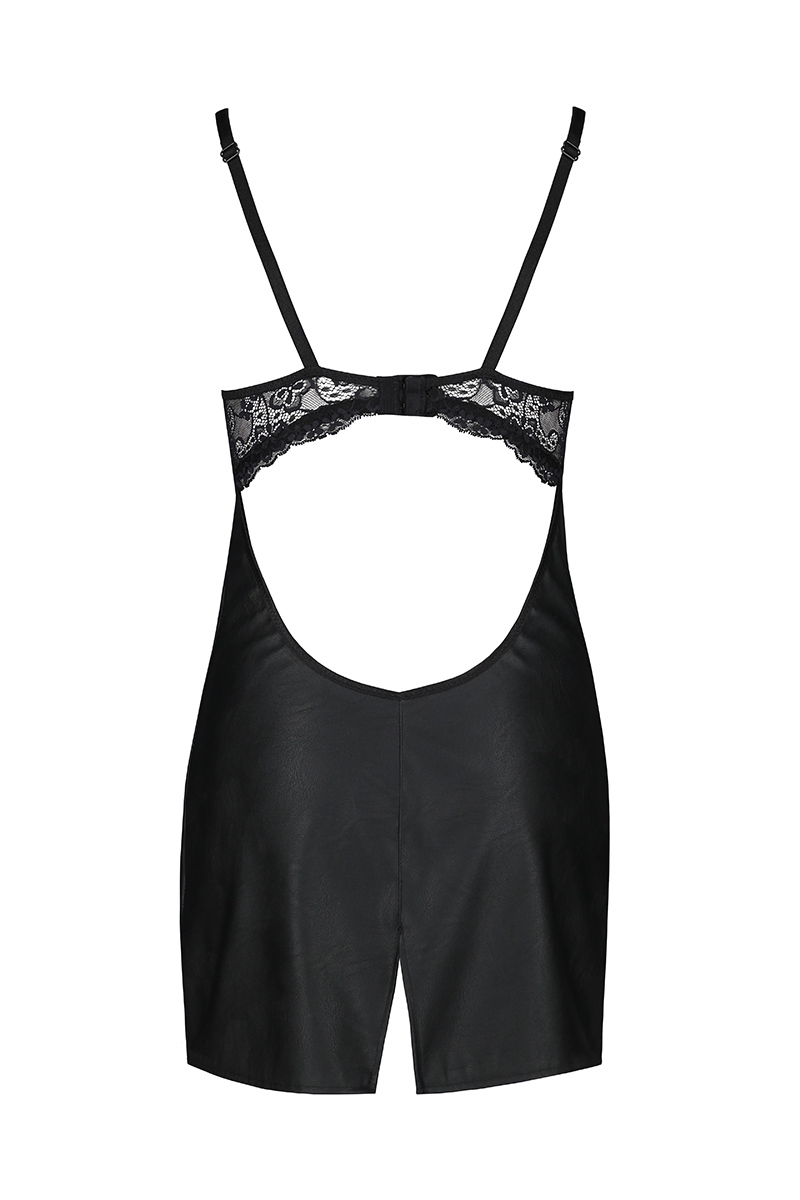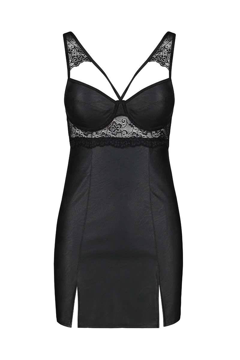Robe lingerie en faux cuir fin et souple finition mat pour plus de style, rehaussée d'une dentelle florale délicate pour la touche glamour, une création de la marque de lingerie érotique Passion.