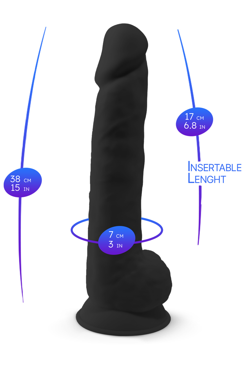 Gode XXL Premium 15 pouces noir, hyper réaliste, dimensions 38 x 7 cm, en silicone double densité à mémoire de forme.
