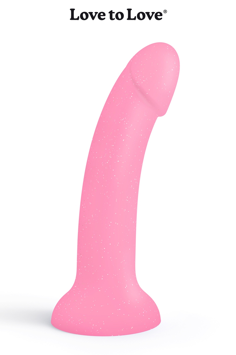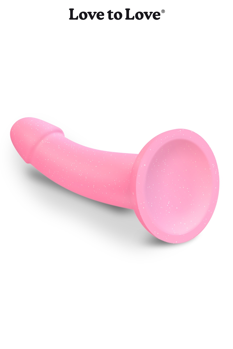Dildo haute qualité, rose à paillettes, en silicone liquide, dimensions 14 x 3,6 cm, Compatible avec les harnais O ring.
