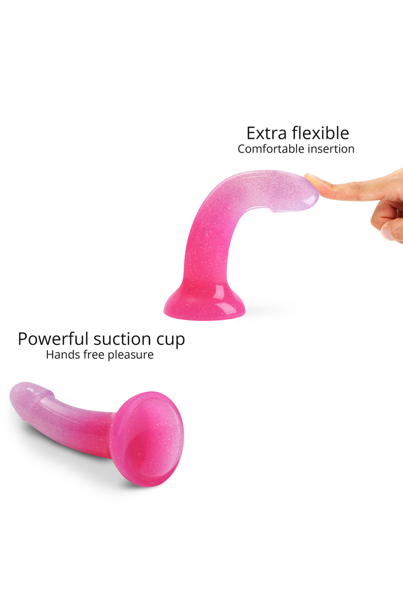 Dildo haute qualité, rose dégradé avec paillettes, en silicone liquide, 14,8 x 3,5 cm, Compatible avec les harnais O ring.