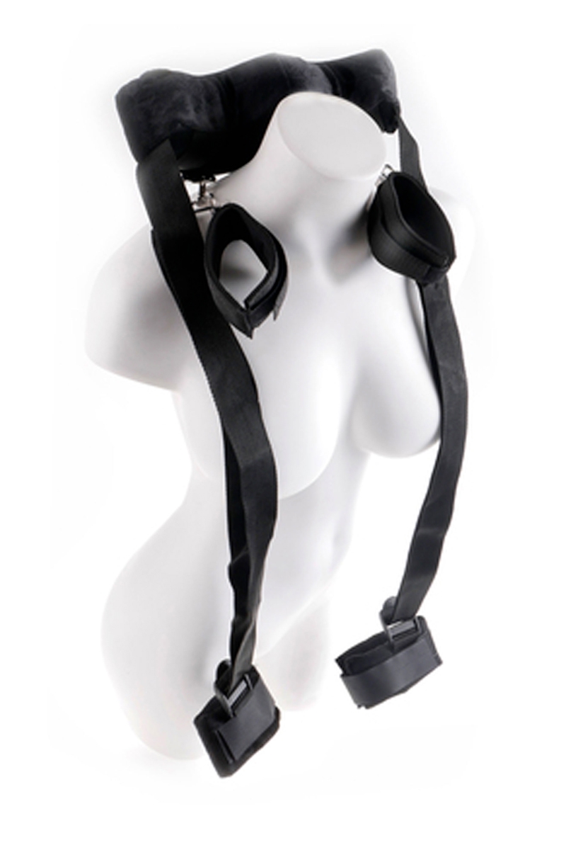 Le harnais se passe autour du cou ou derrière la nuque en fonction de votre position favorite. Les sangles en nylon sont robustes et réglables. Elles relient le harnais aux menottes de chevilles et maintiennent fermement vos jambes en position. Ainsi, vous ne risquez pas de vous fatiguer au moment où ça devient le meilleur!