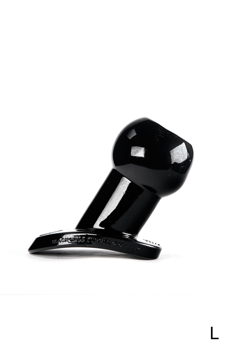 Plug anal noir en TPR, taille large, transpercé par un tunnel sur toute sa longueur.